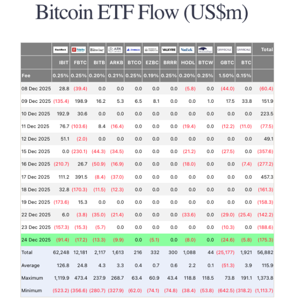 - Die US-Spot-Bitcoin-ETFs haben ihre Verlustserie bis zum verkürzten Handel an Heiligabend fortgesetzt. Wie Daten des britischen Investmenthauses Farside Investors zeigen, beliefen sich die Nettoabflüsse am 24. Dezember auf rund 175,3 Millionen US-Dollar.