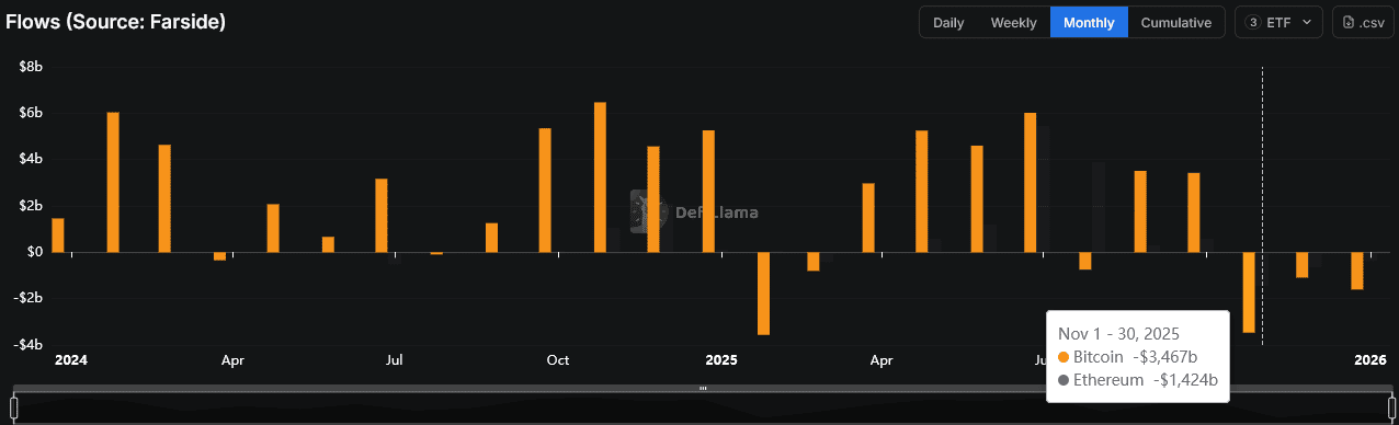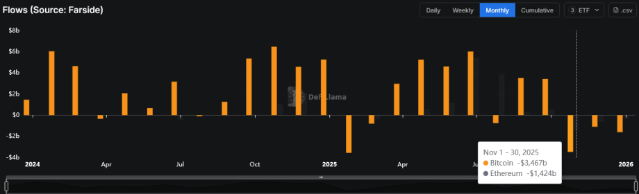 - In dem Zeitraum flossen insgesamt fast 8,5 Milliarden US-Dollar aus der Wall Street. Den Löwenanteil markierte hier der Oktober mit knapp 5 Milliarden US-Dollar an Outflows, an dem Bitcoin von 124.000 auf zeitweise unter 105.000 US-Dollar gefallen war.