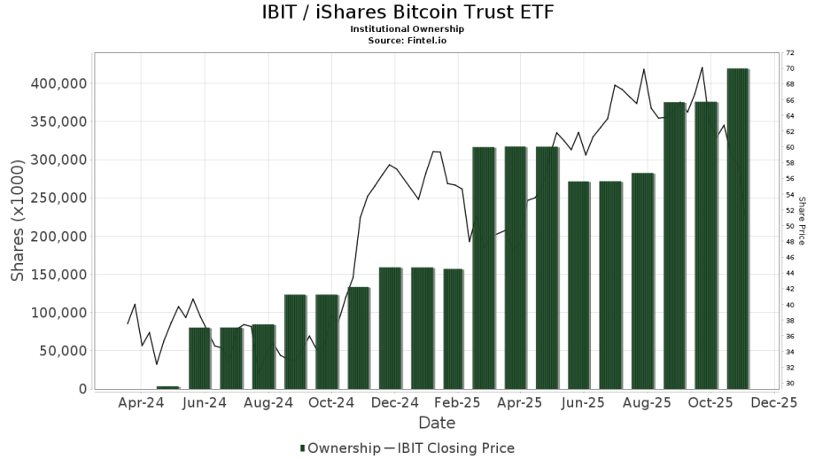 - Zum Stichtag 30. September hielt der Fonds knapp 2,4 Millionen IBIT-Anteile im Wert von 155,8 Millionen US-Dollar. Dies entspricht einer Steigerung von 14 Prozent gegenüber dem Vorquartal.