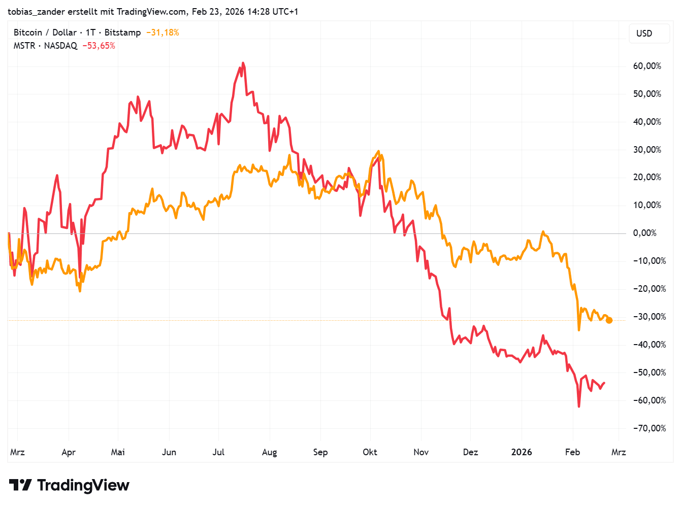 - Der Aktienkurs befindet sich allerdings seit Monaten im Sinkflug. Aktuell handelt die MSTR-Aktie bei 131 US-Dollar und damit 19 Prozent niedriger als im Vormonat. Auf Jahressicht steht Strategy sogar 54 Prozent im Minus und performte damit nochmals deutlich schlechter als die Krypto-Leitwährung, die ihrerseits 31 Prozent abgab.