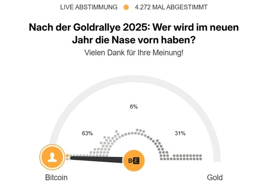 - Das Ergebnis fällt deutlich aus: 63 Prozent trauen BTC im neuen Jahr die bessere Performance zu, während 31 Prozent auf Gold setzen. Weitere 6 Prozent positionieren sich dazwischen und legen sich nicht klar fest.