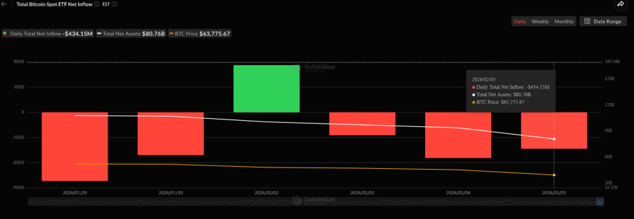 - Und dann wären da noch die anhaltende Schwäche bei den Bitcoin Spot ETFs. Seit gestern flossen aus den Indexfonds in den USA 434 Millionen US-Dollar ab. Das zeigen Daten von SoSoValue. Über die letzten zwei Tage kam es damit zu Outflows in Höhe von fast einer Milliarde US-Dollar.