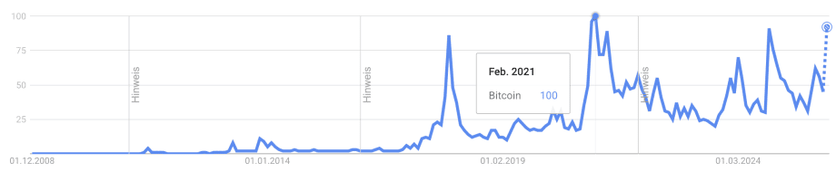 - Das öffentliche Interesse an Bitcoin in Deutschland zieht deutlich an. Bei Google Trends erreicht der Suchbegriff “Bitcoin” aktuell rund 95 Punkte und damit den zweithöchsten Wert seit dem Start des Bitcoin-Netzwerks 2009. Höher lag das Suchinteresse nur im Bullenmarkt 2021 mit dem Maximalwert 100. Entscheidend ist dabei der Kontext: Solche Peaks entstehen nicht zwingend bei neuen Rekorden, sondern häufig in Phasen erhöhter Unsicherheit, in Momenten, in denen Anleger schnelle Einordnung suchen und klären wollen, ob es sich um eine normale Korrektur oder ein strukturelles Problem handelt.