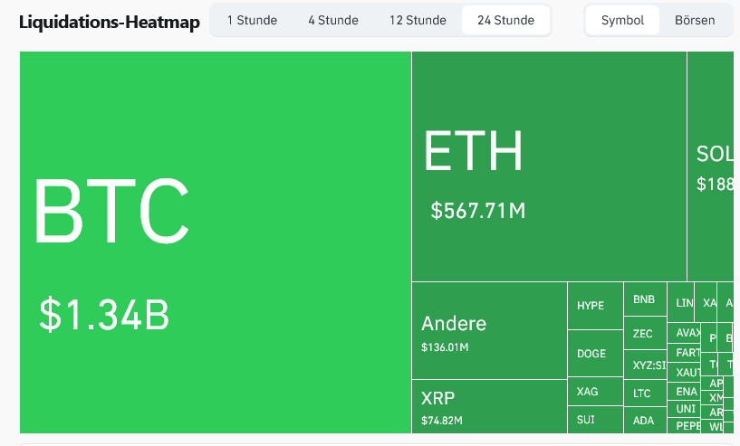 - Mittlerweile konnte sich der Kurs zwar bei 65.000 stabilisieren, dennoch sorgte die Bewegung für ein echtes Blutbad an den Krypto-Derivatemärkten. In den letzten 24 Stunden wurden hier Positionen im Gesamtwert von 2,6 Milliarden US-Dollar liquidiert. Der Großteil davon entfiel auf Bitcoin-Anleger, die auf steigende Kurse gehofft hatten.
