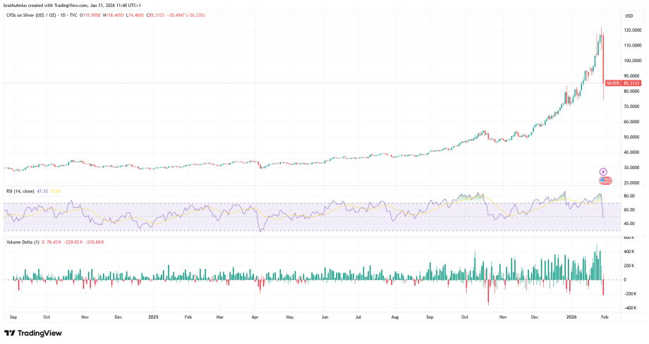 - Infolgedessen zeigte sich an den Krypto-Derivatemärkten ein Novum. Auf tokenisierte Silber-Futures entfiel das höchste Liquidationsvolumen am Krypto-Markt. 142 Millionen US-Dollar wurden in den vergangenen 24 Stunden ausgelöscht. Danach folgte erst Ethereum mit 139 Millionen und Bitcoin mit rund 82 Millionen US-Dollar.