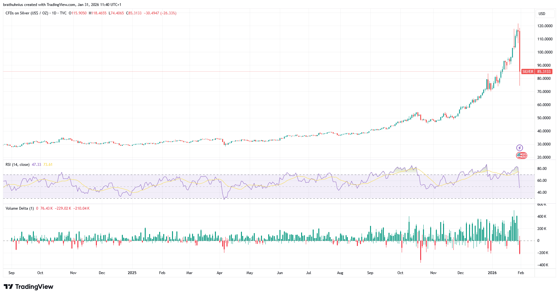 - Das Hauptaugenmerk bleibt aber definitiv auf den Edelmetallen. Silber erlebte am gestrigen Handelstag den größten Abverkauf seiner Geschichte. Von 118 US-Dollar krachte das Edelmetall auf zwischenzeitlich 74 US-Dollar – 35 Prozent Kursverlust an nur einem Tag. Zu Börsenschluss lag der Kurs bei rund 85 US-Dollar.