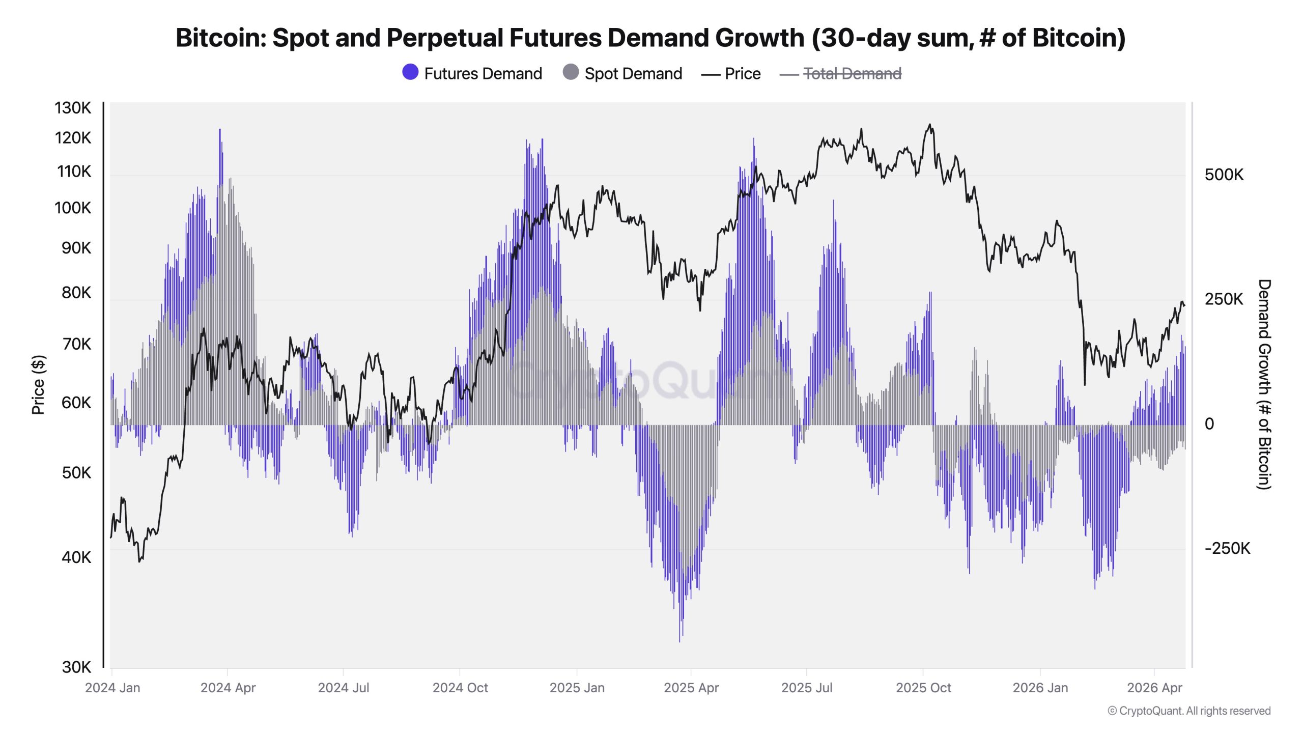 “Bitcoin wird derzeit von Futures getrieben. Das Open Interest steigt, doch die auf der Blockchain erkennbare Nachfrage bleibt trotz ETF-Zuflüssen und Käufen von Saylor netto negativ”, schreibt der erfahrene Krypto-Marktbeobachter. Die Diskrepanz zwischen Spot- und Futures-Nachfrage ist vor allem deshalb bedeutend, weil Positionen in Perpetual Futures mit Hebelwirkung schnell eröffnet, aber ebenso schnell wieder glattgestellt werden können. Der klassische Spot-Kauf erfordert dagegen frisches Kapital, um das Angebot tatsächlich zum aktuellen BTC-Kurs aufzunehmen.