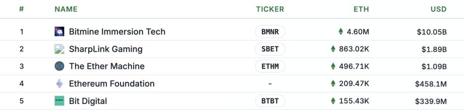 Bitmine ist damit der mit Abstand größte institutionelle ETH-Halter der Welt. Auf Platz zwei und drei folgen SharpLink, das Unternehmen von Ethereum-Mitbegründer Joe Lubin, mit rund 863.000 ETH und The Ether Machine mit knapp 497.000 ETH.