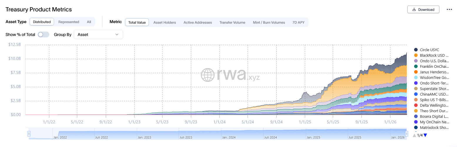 Der gesamte Markt für tokenisierte US-Staatsanleihen ist seit Jahresbeginn deutlich gewachsen. Laut RWA.xyz hat der Sektor seit Jahresanfang rund 2,5 Milliarden US-Dollar hinzugewonnen, was einem Wachstum von etwa 27 Prozent entspricht. Damit beläuft sich das Gesamtvolumen inzwischen auf über elf Milliarden US-Dollar.