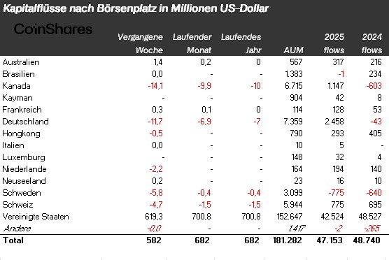 - Das deutlichste Wachstum kam jedoch aus Deutschland. Hier beliefen sich die Zuflüsse auf 2,5 Milliarden US-Dollar, nachdem 2024 noch Abflüsse von 43 Millionen US-Dollar verzeichnet worden waren.