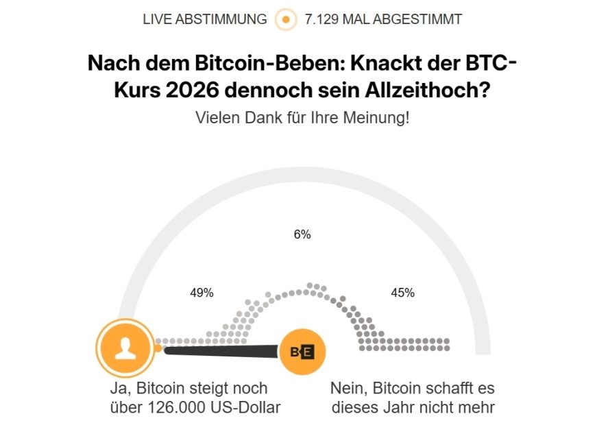 - 45 Prozent sind bearish und rechnen im Jahr 2026 nicht mit neuen Höchstständen. Sechs Prozent sind unentschlossen. An der Liveabstimmung haben insgesamt 7.129 Leserinnen und Leser teilgenommen.
