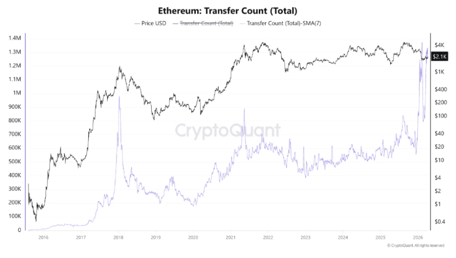 Die Netzwerkaktivität von Ethereum hat ein neues Allzeithoch erreicht. Wie Daten von CryptoQuant zeigen, ist der gleitende Sieben-Tage-Durchschnitt der täglichen Transaktionen über die Marke von 1,3 Millionen geklettert. Der Anstieg belegt laut der Analyseplattform eine hohe Nutzung der Ethereum-Blockchain durch DeFi und Layer-2-Anwendungen.