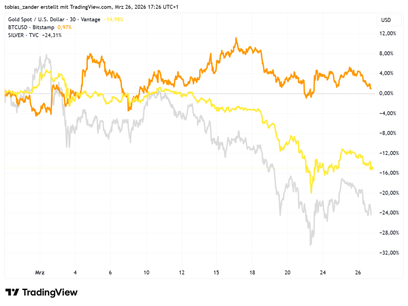 Während sich Bitcoin und die Krypto-Kurse seit Mitte Oktober auf Talfahrt befanden, konnten Gold und Silber regelmäßig neue Rekorde feiern. Selten sorgten die beiden Edelmetalle für so große Begeisterung unter Privatanlegern wie im Jahr 2025. Doch die vergangenen Wochen wecken starke Zweifel an der Nachhaltigkeit der Entwicklung. Auf Monatssicht steht Bitcoin mit einem Plus von einem Prozent trotz der militärischen Eskalation im Nahen und Mittleren Osten solide dar, doch Gold und Silber korrigierten um 15 respektive 24 Prozent – ein schmerzhafter Einbruch.