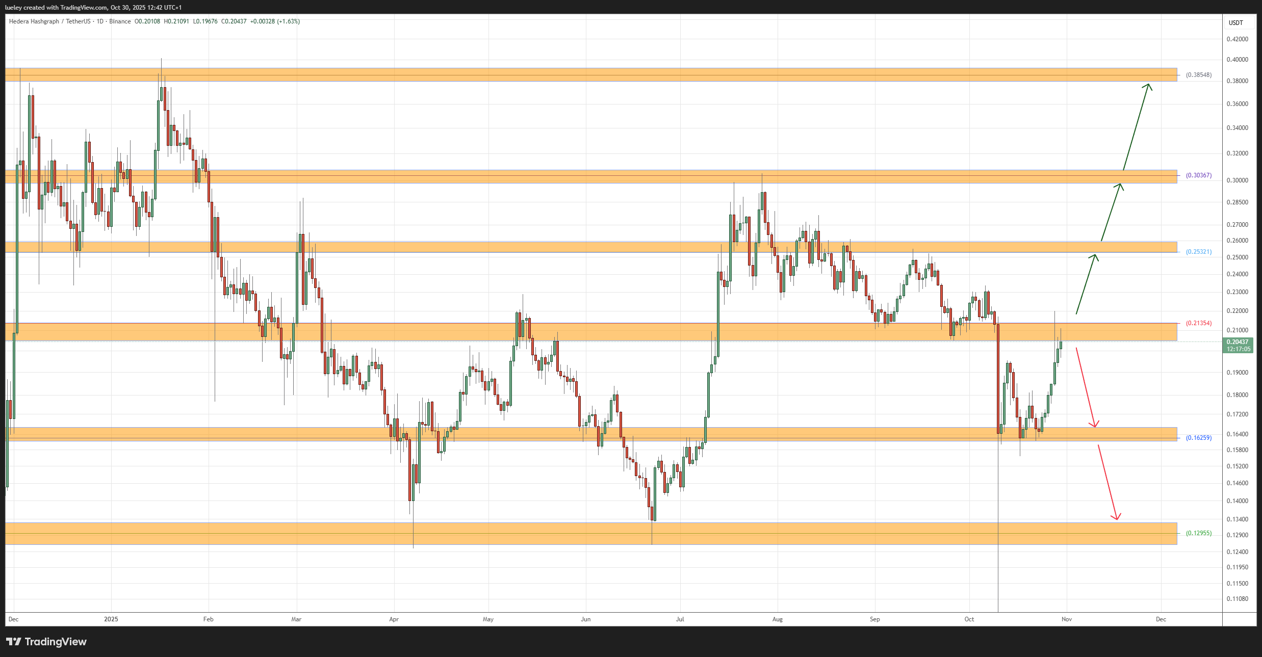 - Der HBAR-Kurs stieg in den letzten Tagen bis an die Widerstandszone um 0,21 US-Dollar. Kann dieser Bereich zeitnah überwunden werden, steigt die Chance auf einen Durchmarsch bis an das Vormonatshoch bei 0,25 US-Dollar weiter an. Erreicht Hedera diesen Zielbereich und zeigt sich weiter bullish, ist mittelfristig mit einem Durchmarsch in Richtung des Verlaufshochs aus dem Juli bei 0,30 US-Dollar zu planen.