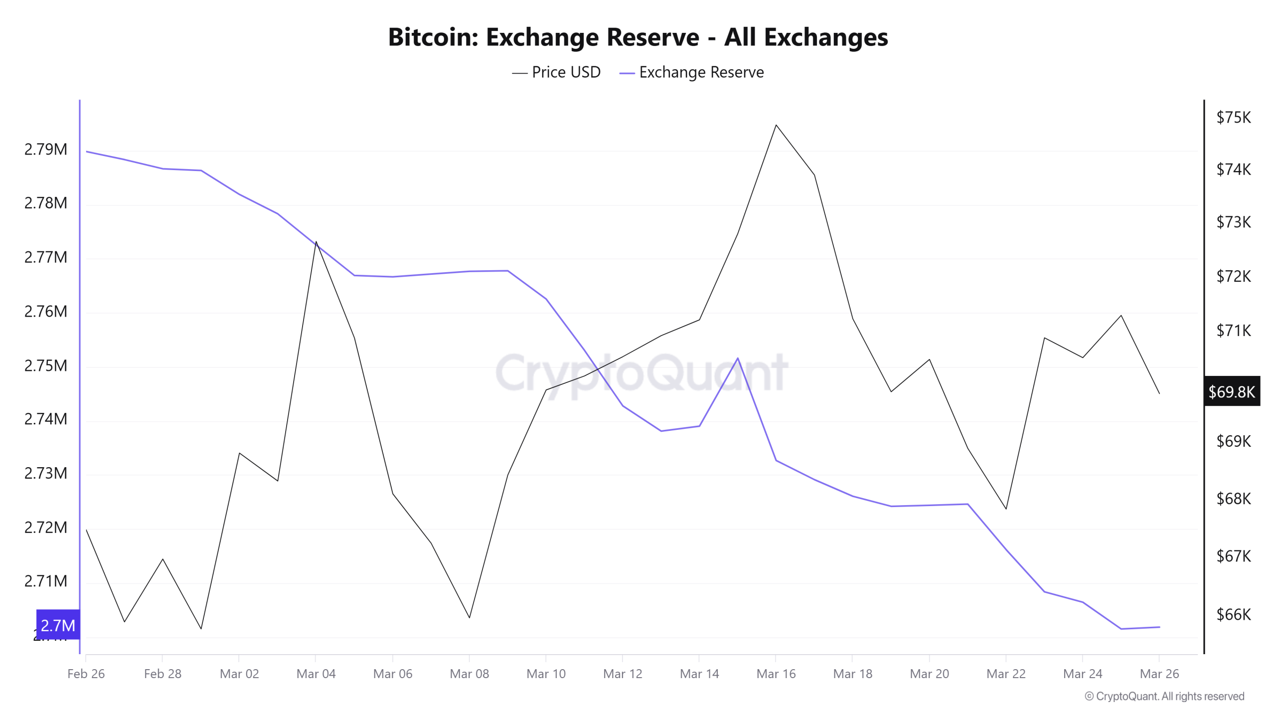 Während der Bitcoin-Kurs erneut um die 70.000 US-Dollarmarke kämpft, fallen die BTC-Bestände an Krypto-Börsen auf ein neues Tief. Laut On-Chain-Daten von CryptoQuant sind seit Ende Februar rund 88.000 BTC von den Handelsplattformen abgezogen worden. Lagen am 26.02. noch 2,789 Millionen BTC bei Binance, Coinbase und Co., sind es derzeit nur noch 2,701 Millionen. Vor dem Hintergrund des Crashs im Februar hatten verkaufswillige Anleger ihre Coins zwischenzeitlich vermehrt auf Krypto-Börsen eingezahlt.