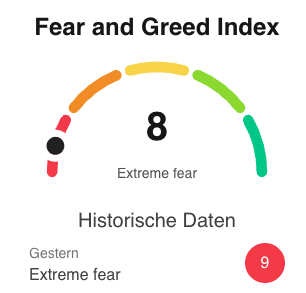 - Das Marktsentiment ist wenig überraschend weiterhin negativ. Mit acht von 100 Punkten verzeichnet es sogar einen Punkt Abschlag gegenüber dem Vortag und kann als “extreme Angst” beschrieben werden.