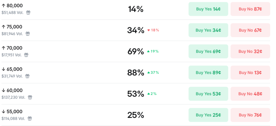 Wie sehr belastet die derzeitige geopolitische Situation den Kryptomarkt? Aufschluss geben Daten des Prognosemarktes Polymarket. Für Bitcoin (BTC) zeichnet sich dabei ein eher pessimistisches Szenario ab, da der Markt die Wahrscheinlichkeit für einen Rücksetzer unter die Marke von 65.000 US-Dollar mit 88 Prozent einpreist. Zwar wird eine Erholung über 70.000 US-Dollar noch mit einer Wahrscheinlichkeit von 69 Prozent gehandelt, doch scheint die Abwärtstendenz derzeit zu überwiegen, während ein tieferer Fall unter 60.000 US-Dollar mit 53 Prozent als moderat wahrscheinlich gilt.