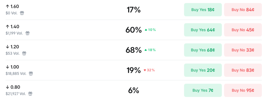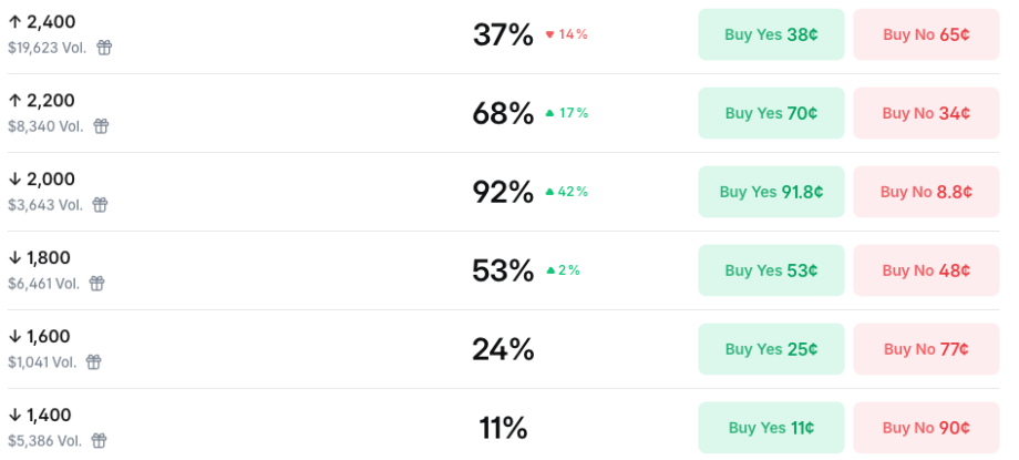 Noch deutlicher fällt die bärische Stimmung bei Ethereum (ETH) aus. Hier taxiert der Prognosemarkt die Wahrscheinlichkeit, dass die zweitgrößte Kryptowährung unter 2.000 US-Dollar notieren wird, auf 92 Prozent. Ein Anstieg über das Niveau von 2.200 US-Dollar wird mit 68 Prozent bewertet, während sogar ein Abrutschen unter 1.800 US-Dollar mit einer Wahrscheinlichkeit von 53 Prozent im Bereich des Möglichen liegt.