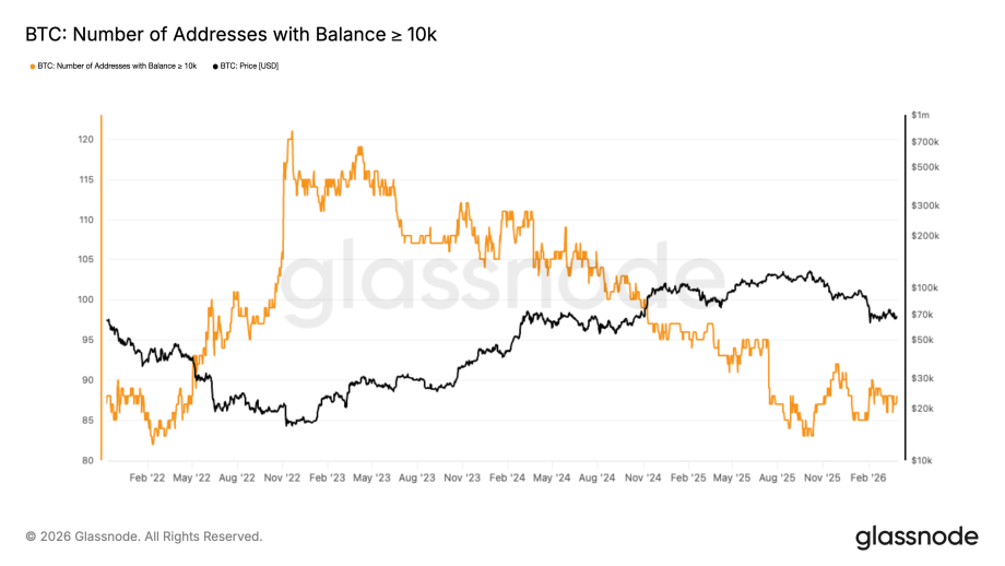 Bitcoin-Wale haben ihre BTC-Positionen zuletzt massiv reduziert. Laut CryptoQuant sanken die Netto-Bestände dieser Gruppe innerhalb eines Jahres um rund 188.000 BTC. Gemeint sind Adressen, die zwischen 1.000 und 10.000 BTC halten.
