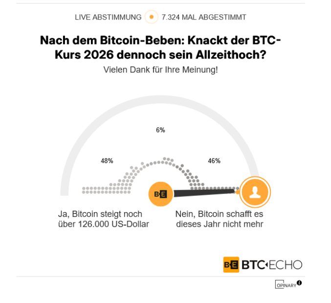 - Die jüngste Umfrage in der BTC-ECHO-Community zeigt, wie gespalten die Stimmung nach dem jüngsten Kursrutsch ist. Auf die Frage, ob Bitcoin 2026 trotzdem noch sein Allzeithoch knackt, haben 7.324 Leser abgestimmt – mit einem hauchdünnen Vorsprung für die Bullen.