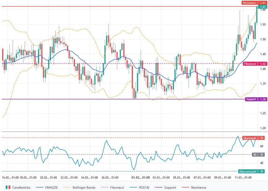 Der Kurs notiert deutlich oberhalb des EMA-20, der derzeit bei 1,48763 US-Dollar verläuft. Auch die Abfolge höherer Hochs und höherer Tiefs in den vergangenen drei Kerzen spricht für kurzfristige Stärke. Unmittelbare Unterstützungen liegen bei 1,556 US-Dollar sowie am EMA-20 bei 1,48763 US-Dollar. Ein direkter Widerstand befindet sich bei 1,611 US-Dollar. Solange der Kurs oberhalb des EMA-20 bleibt, ist das kurzfristige Bild bullish.