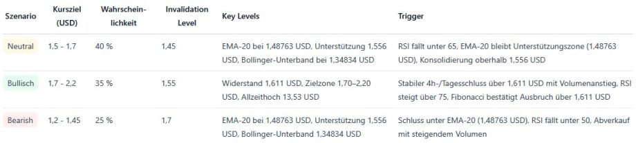 Ein stabiler Schlusskurs oberhalb von 1,611 US-Dollar bei anziehendem Volumen könnte die Rallye in Richtung 1,70 bis 2,20 US-Dollar fortsetzen. Fällt der Kurs hingegen unter 1,48763 US-Dollar, würden sich bärische Szenarien in den Vordergrund rücken. Angesichts der zunehmenden Volatilität bleibt ein aktives Risikomanagement in jedem Fall wichtig.