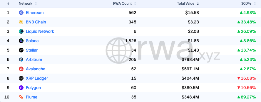 Laut Daten von rwa.xyz hält Ethereum aktuell die meisten RWA-Marktanteile, gefolgt von der BNB-Chain.
