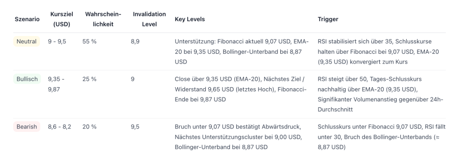 Kurzfristig bleibt die Prognose neutral bis leicht bärisch, da Kurs unter EMA-20, RSI schwach und Volatilität moderat sind. Wichtige Unterstützungen: 9,07 US-Dollar (Fibonacci) und 9,00 US-Dollar; Widerstände: 9,35 US-Dollar (EMA-20) und 9,65 US-Dollar (letztes Hoch). Für Dich: Ein nachhaltiger Schlusskurs über 9,35 US-Dollar würde kurzfristig Risiko reduzieren; ein Bruch unter 9,07 US-Dollar erhöht die Wahrscheinlichkeit stärkerer Rücksetzer. Behalte Volumen und RSI zur Bestätigung; ohne klaren Ausbruch ist kurzfristig mit Seitwärtsbewegung zu rechnen.