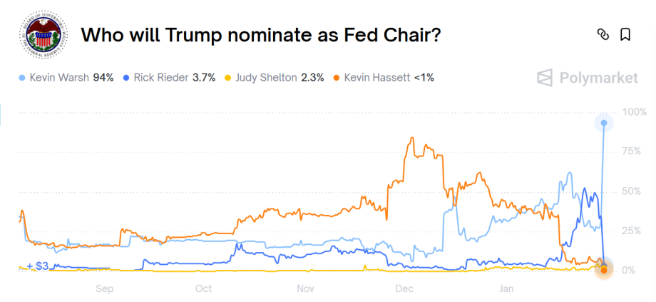 - Kevin Warsh steht offenbar kurz vor einem Comeback an der Spitze der US-Notenbank. Laut Bloomberg bereitet die Trump-Regierung dessen Nominierung zum Vorsitzenden der Federal Reserve vor. Polymarket taxiert seine Chancen mit 94 Prozent – eine offizielle Bekanntgabe durch Donald Trump wird für den heutigen 30. Januar erwartet.