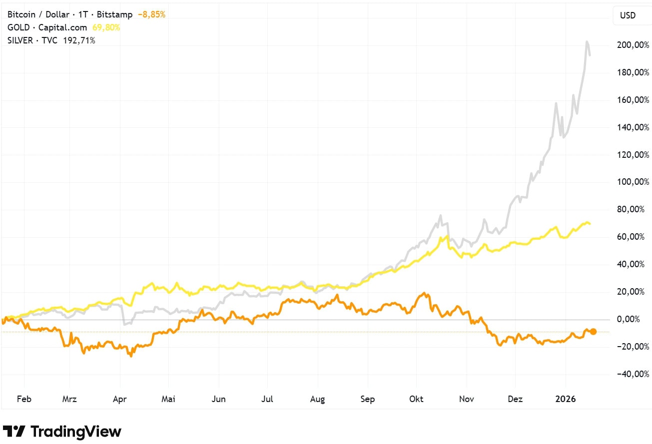 - Für Gold und Silber bedeute das, “mehr physisches Metall zu kaufen und sich mit nach wie vor unglaublich unterbewerteten Minenaktien einzudecken”. Auf Jahressicht konnte der Goldpreis um 70 Prozent zulegen, der Silberpreis sogar um 193 Prozent. Dagegen musste der Bitcoin-Kurs im gleichen Zeitraum 9 Prozent abgeben.