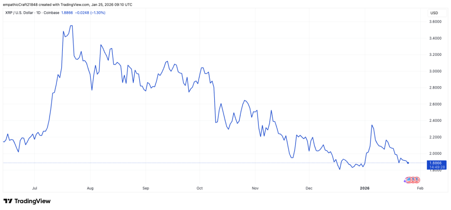 - Seit Juli 2025 befindet sich Ripple (XRP) im Bärenmarkt. Der Token von Ripple hat seit dem Allzeithoch am 18. Juli 2025 48 Prozent abgewertet und notiert zum Zeitpunkt des Schreibens nur noch bei 1,89 US-Dollar.