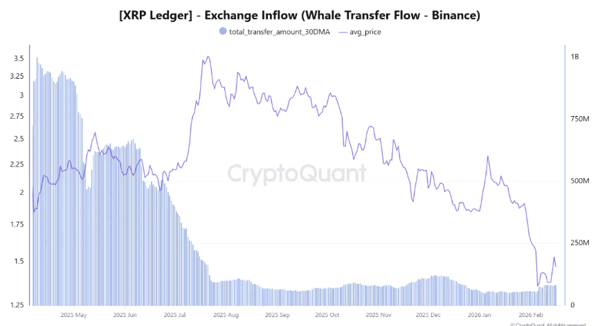 - Die On Chain-Daten zeigen aktuell eine deutliche Zunahme großer XRP-Transfers in Richtung Krypto-Börsen. Vor allem Binance verzeichnet wieder steigende Zuflüsse. Der gleitende 30-Tage-Durchschnitt großer Transfers liegt inzwischen bei rund 82,1 Millionen XRP und erreicht damit den höchsten Stand seit Dezember 2025.